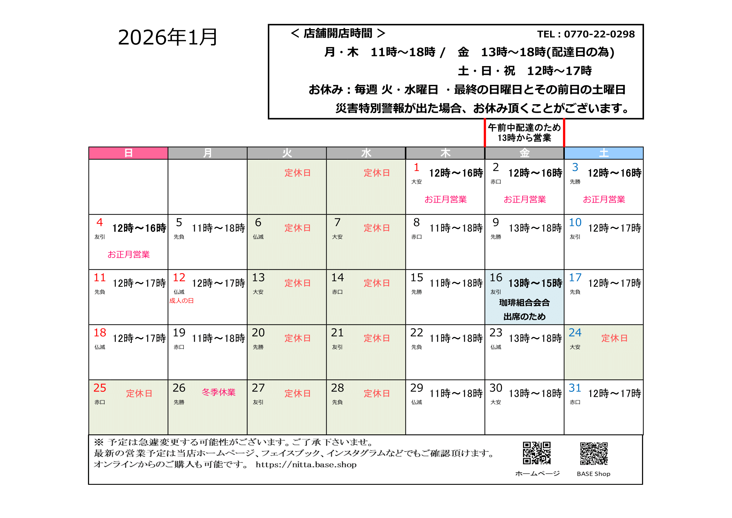 * 2026年1月 営業予定表のお知らせ*