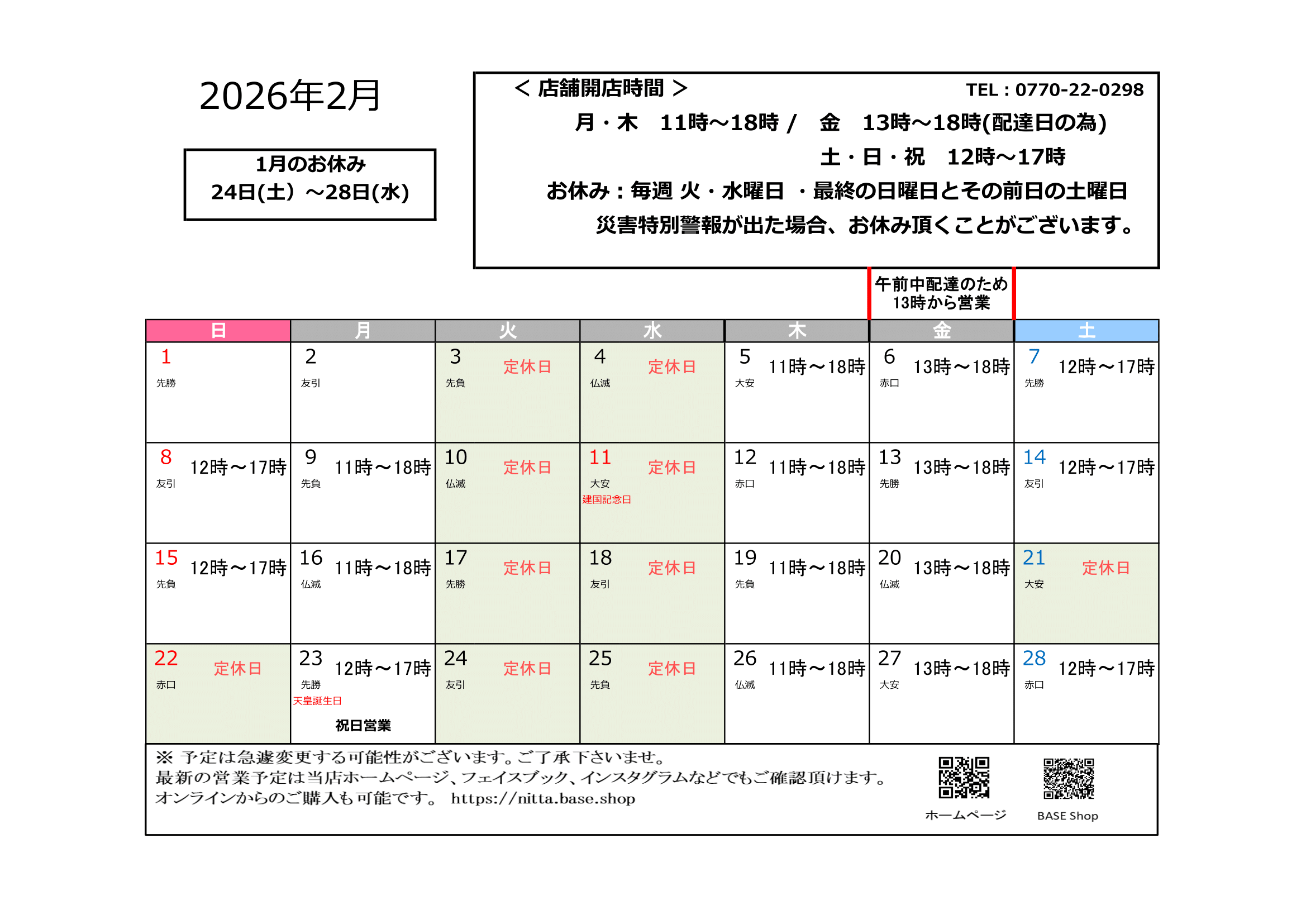 2026年2月の営業予定表のご案内です。